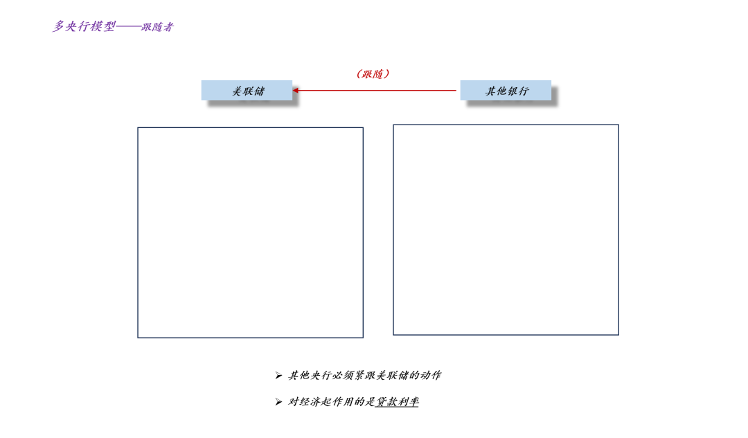 如上图所示,我们对假设稍作修改,让世界上存在两类央行,一个是美联储,一个是其他央行。如果我们想要“降低刺激经济或者通胀”的教条成立,那么,我们必须要求一点:其他央行必须紧跟美联储的动作,美联储降息,其他央行也跟着降息,反之亦然。