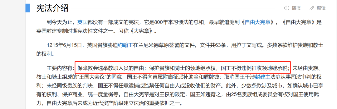 这又是为什么呢??这要求我们回归到英美国家的政治内核——《自由大宪章》,这份文件的内核就是,贵族集团限制国王,也就是说,他们的自由是贵族的自由,不是牛马们的自由;他们实现贵族自由的手段就是限制国王。