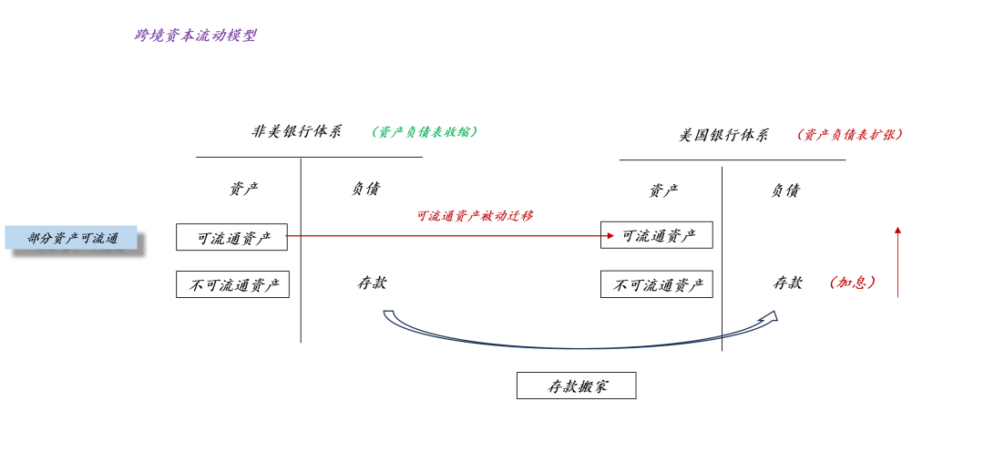 如上图所示,如果美国银行体系加息,其他央行保持利率不变,那么,会出现全球范围内的存款搬家,大量的存款会涌向美国银行体系,导致美国资产负债表扩张。对称的,其他银行体系的资产负债表会出现收缩。