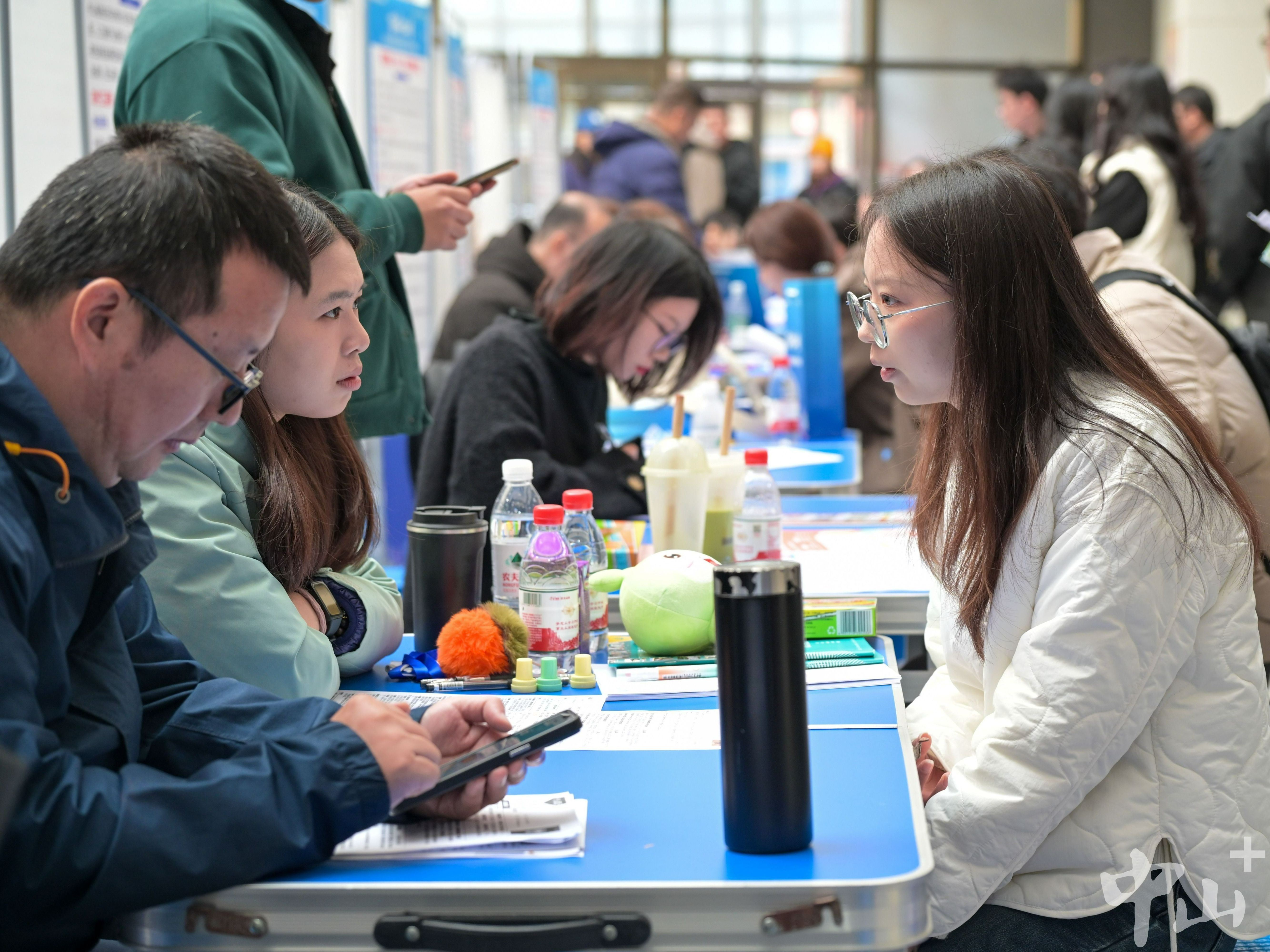 辽宁大学专场,毕业生在中山企业的展位前咨询了解。见习记者 张景天 摄