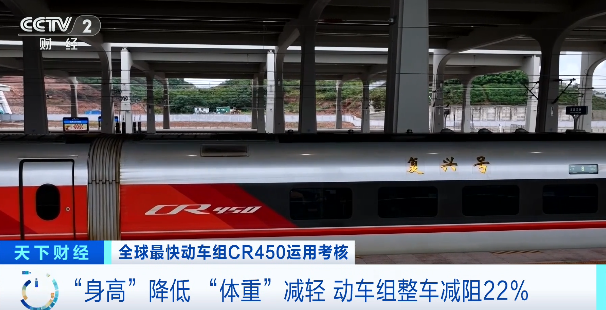 CR450动车组为什么能跑这么快?首先,CR450动车组车头是15米长,比目前时速350公里的复兴号长2.5米,车头更尖更细,阻力更小。其次,整个车身更加紧致,车底部的裙板更低,车轮露出的部分更少,像跑车一样,底盘越低,跑得越快。还有,它的高度降低了20厘米,重量减轻了50吨。近五年来,研发人员以0.1%的减阻率为最小单位,一点点持续精进,最终让整列车的阻力减小了22%。